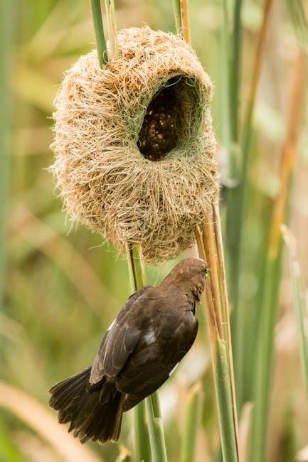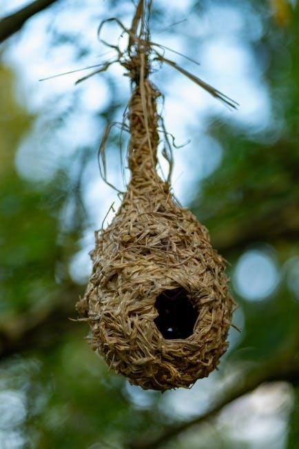 The construction process, thoroughly illustrated in PDF field guides, involves meticulous weaving and knotting techniques, demonstrating advanced avian dexterity and problem-solving skills․ These nests offer significant protection from ground predators․